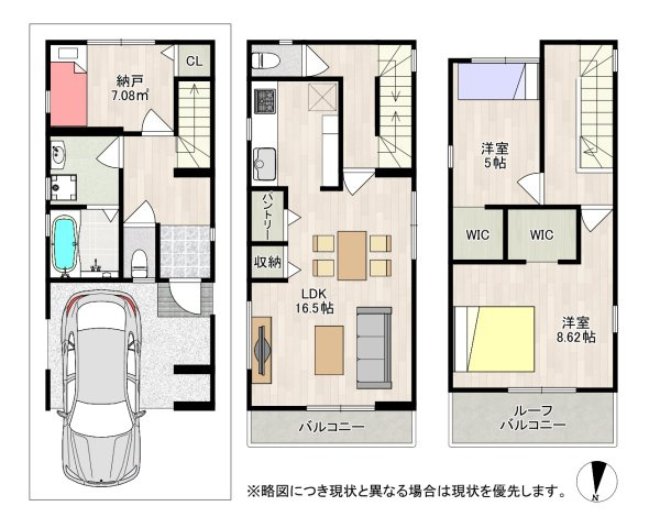 【間取り】◆1号棟 間取り図 価格 2,880万円 土地面積 59.04㎡ 建物面積 108.03㎡ 構造間取り 木造在来軸組工法3階建2LDK+S+車庫 築年月 2025年8月