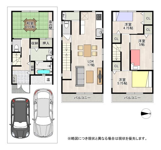 【間取り】◆間取り図 価格 3,300万円 土地面積 66.86㎡ 建物面積 98.40㎡ 構造間取り 木造3階建4LDK+2台分カースペース 築年月 2005年5月